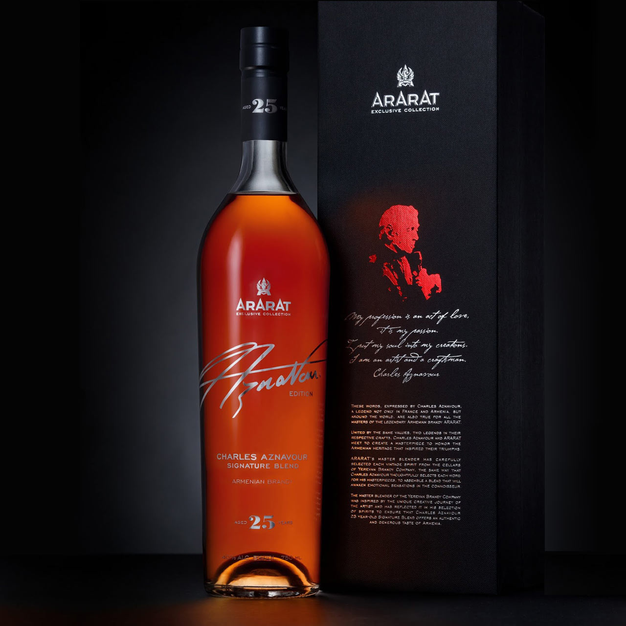 ARARAT Charles Aznavour Signature Blend rayonne d'un ambre foncé profond avec de légers reflets acajou et dorés. Le bouquet complexe est une symphonie de vieux bois, de caramel et de chocolat avec un arôme riche et doux avec des notes de réglisse et de fruits secs. Long et persistant avec une finale parfaitement équilibrée.