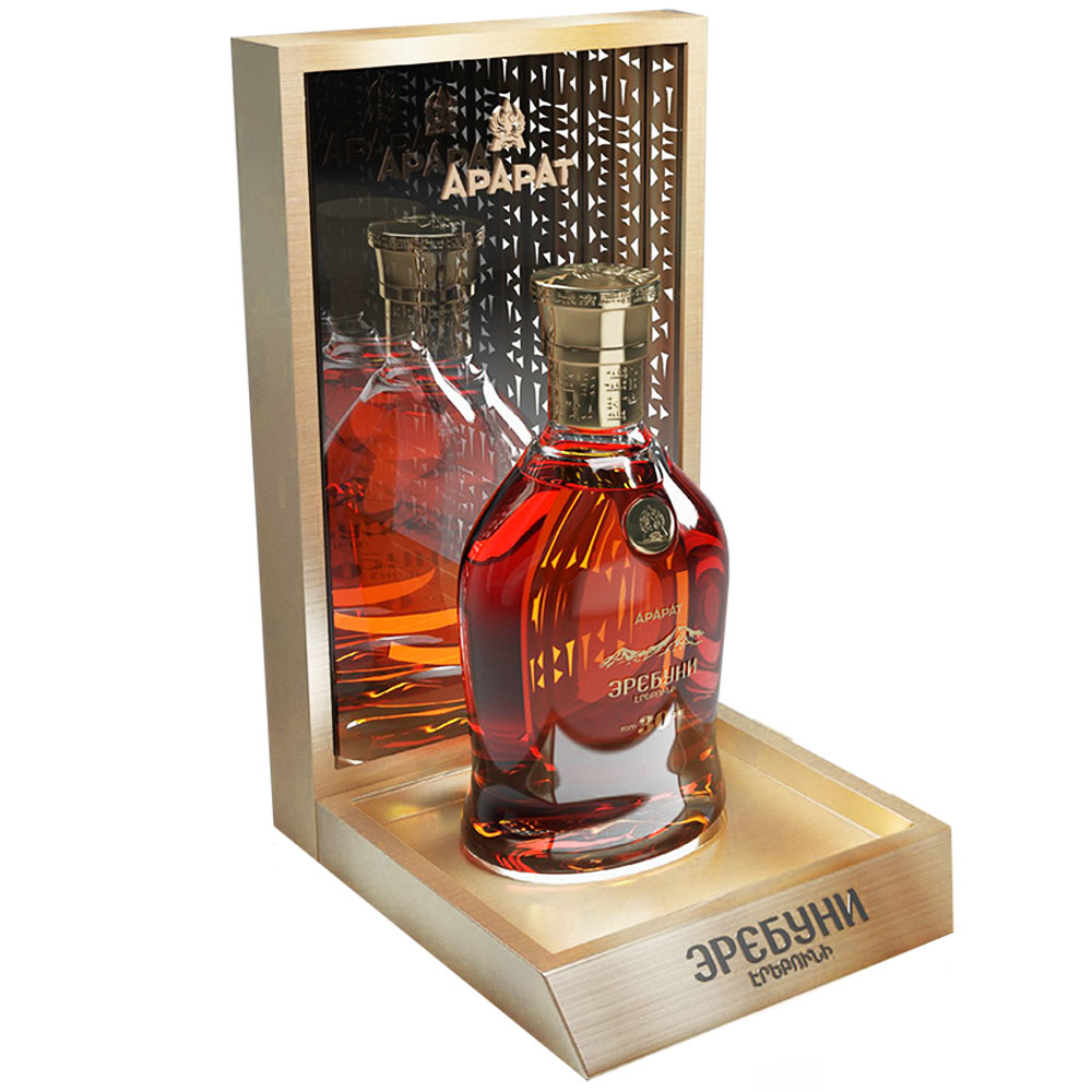 ArArAt Erebuni, âgé de 30 ans, est présenté dans un luxueux emballage en or gravé de cunéiformes anciens reprenant l'inscription sur la pierre. Le brandy ArArAt Erebuni 30 ans d'âge est composé de plus de 30 spiritueux rares et anciens qui ont attendu leur heure dans les caves de la Yerevan Brandy Company. L'eau-de-vie la plus ancienne du mélange date de 1934. C'est pourquoi l'Erebuni a une riche couleur ambrée avec des touches d'acajou.