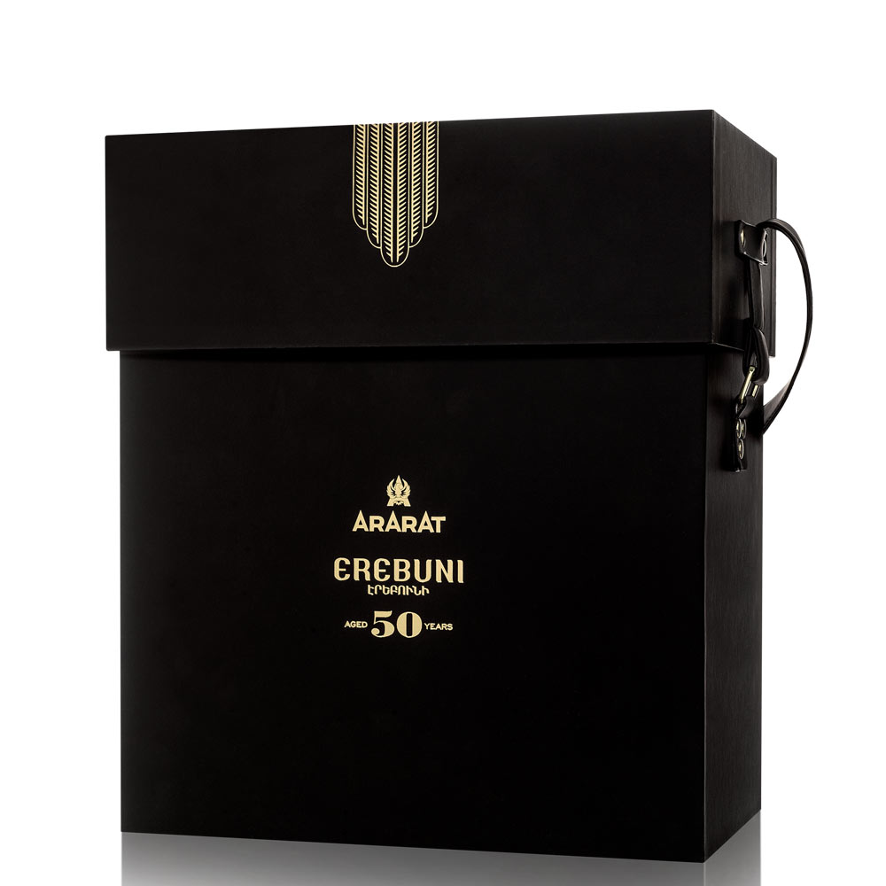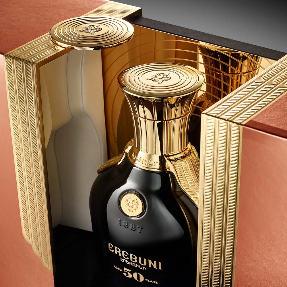 Le mélange premium ArArAt "Erebuni 50" est une combinaison harmonieuse de plus de 50 types de spiritueux rares, dont le plus ancien - l'échantillon le plus rare de la réserve de la distillerie - est âgé de 104 ans. Les distillats sont fabriqués exclusivement à partir de raisins cultivés dans la vallée d'Ararat et contiennent toute la puissance de la nature. L'emballage cadeau et le design de la carafe s'inspirent de l'histoire de l'Arménie et de l'héritage de plusieurs générations d'artisans de l'usine. Les détails dorés rappellent les ailes symboliques des anciens dieux, dont les images ornent encore aujourd'hui les bas-reliefs de la forteresse d'Erebuni.